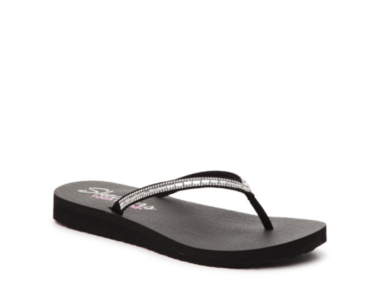 Skechers Meditation Chill Vibes Black Diamante Low Wedge Comfort Flip Flops Sandals